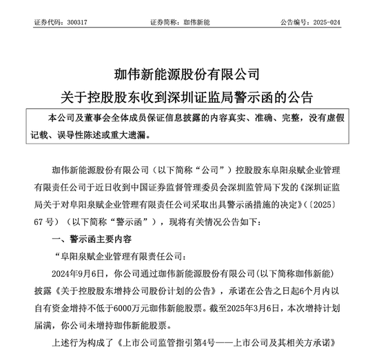 4月30日晚,珈伟新能公告称,公司控股股东阜阳泉赋企业管理有限责任公司(简称“阜阳泉赋”)因未履行“6个月内增持不低于6000万元公司股份”的承诺,收到深圳证监局出具的警示函。这是继2024年11月公司股东信披违规、2024年8月一致行动人违规减持后,公司及关联方再次暴露出公司治理问题。